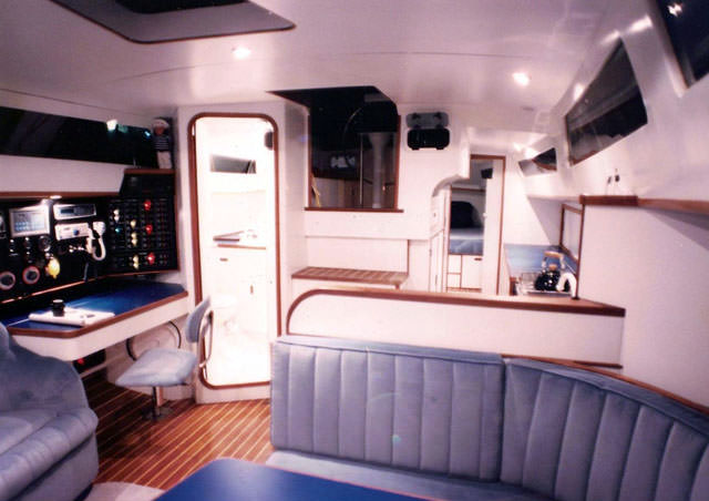 Clean white interior with teak trim, very comprehensive nav-station and galley.